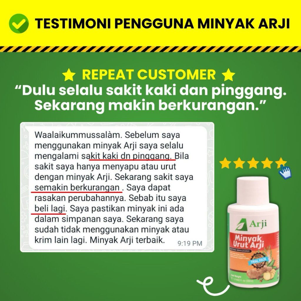 PELANGGAN DIBAWAH DAH DAPAT RASAKAN PERUBAHAN SELEPAS MENGGUNAKAN MINYAK URUT ARJI DAN TIDAK MENGGUNAKAN MINYAK ATAU KRIM LAIN.